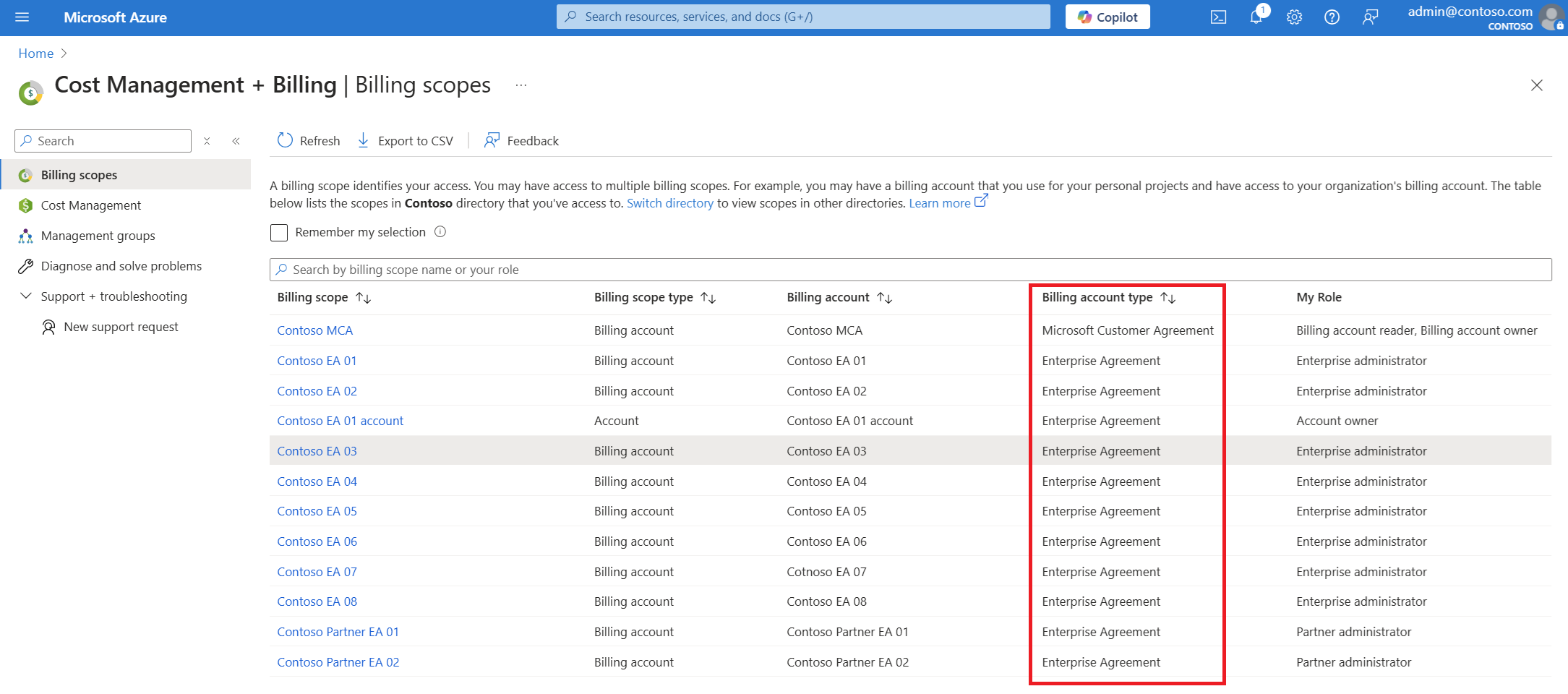 If you have access to multiple billing scopes, select Billing scopes from the left menu, and then check the type in the Billing account type column.