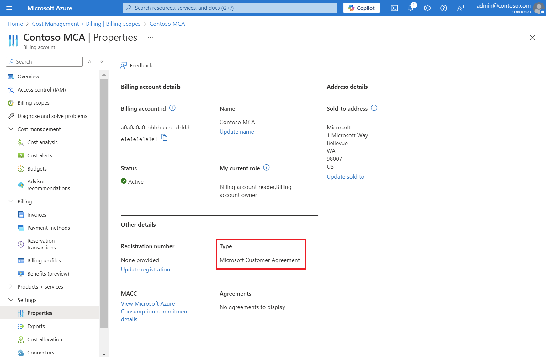 The Type value on the Properties pane determines the type of your account. It can be Microsoft Online Subscription Program, Enterprise Agreement, Microsoft Customer Agreement, or Microsoft Partner Agreement. To learn more about the types of billing accounts, see View your billing accounts in the Azure portal.