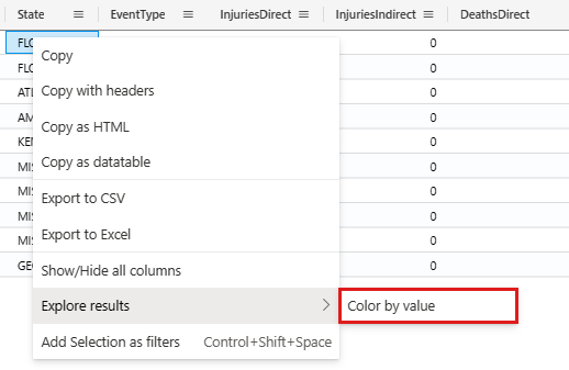 StormEvents | where EventType == "Lake-Effect Snow"Mouse-over the State column, select the menu, and select Group by State.