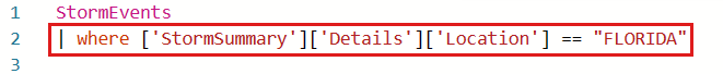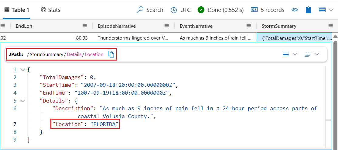 Locationfield, which is nested under theDetailsfield within theStormSummarycolumn dynamic property-bag object.Select the icon to the right of the JPATH to copy it. Then, paste and use the JPATH as a filter or share it with others.