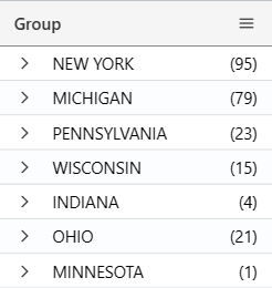 In the grid, double-click on a record to expand and see records for that state. For example, expand the records for "INDIANA". This type of grouping can be helpful when doing exploratory analysis.