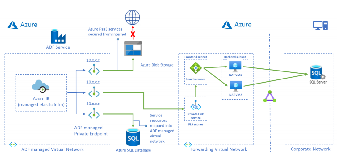 This tutorial provides steps for using the Azure portal to set up Private Link Service and access on-premises SQL Server from a managed virtual network using a private endpoint. Using a managed virtual network ensures that traffic to and from your on-premises SQL source will all pass through your own private endpoint, thereby securing exposure to the public cloud with an extra layer of security and isolation. The required resources mentioned below are necessary to support the scenario.