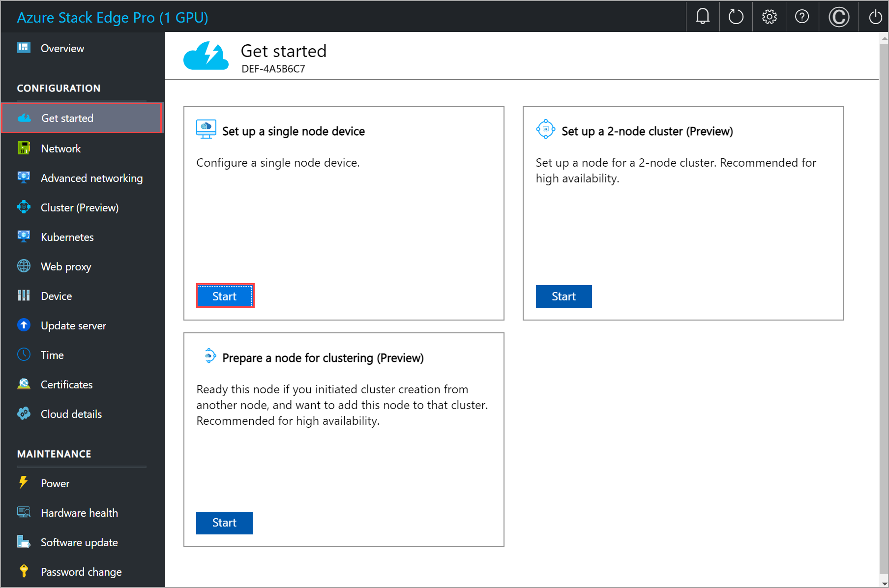 Your Get started page displays the various settings that are required to configure and activate the physical device with the Azure Stack Edge service.