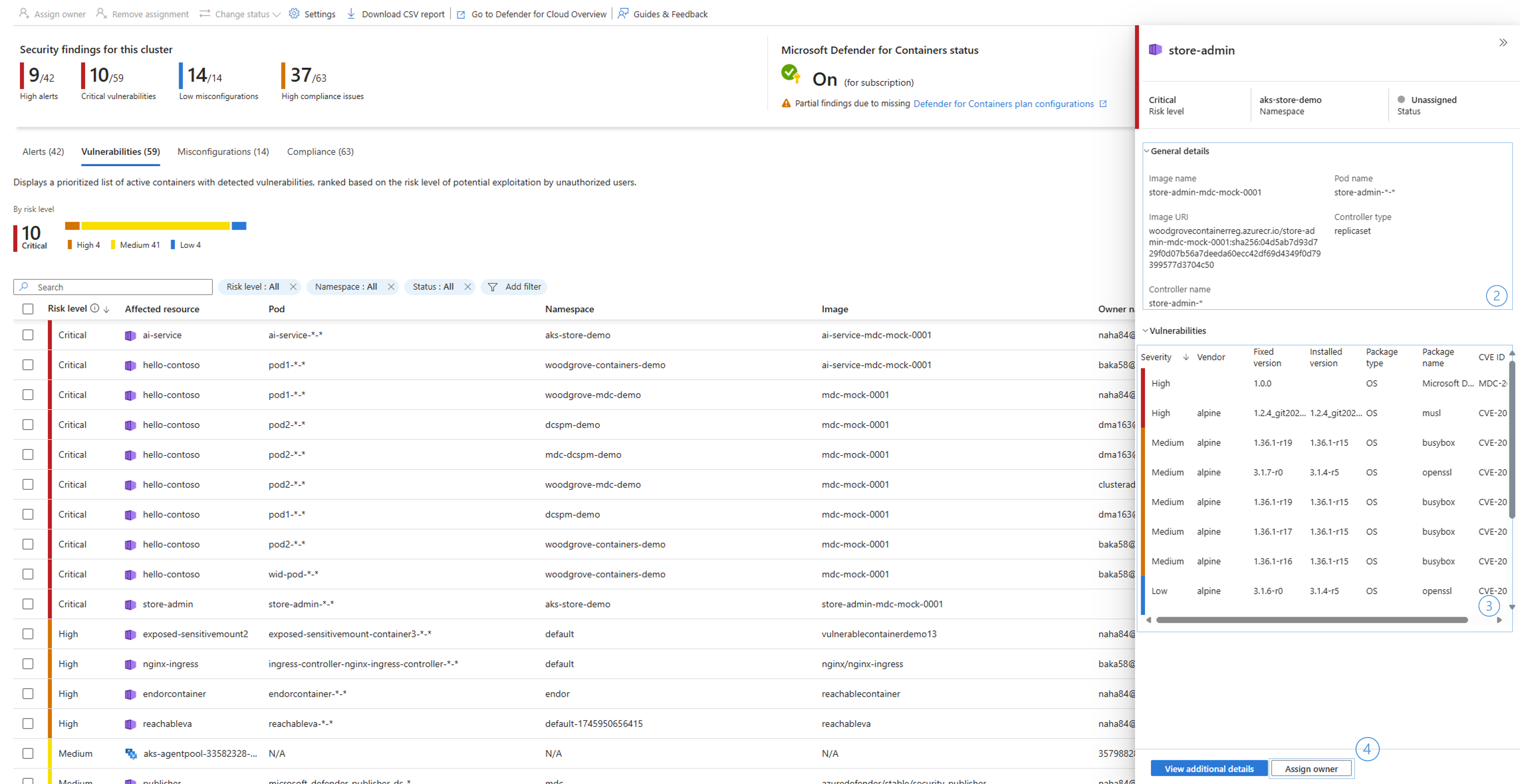 The AKS security dashboard shows software vulnerability scan results for running containers and the cluster's node pools. It generates a prioritized list of vulnerable components. This list is ranked by a dynamic engine that assesses the risks in your environment (available with Defender CSPM plan enabled) and considers the potential for exploitation.