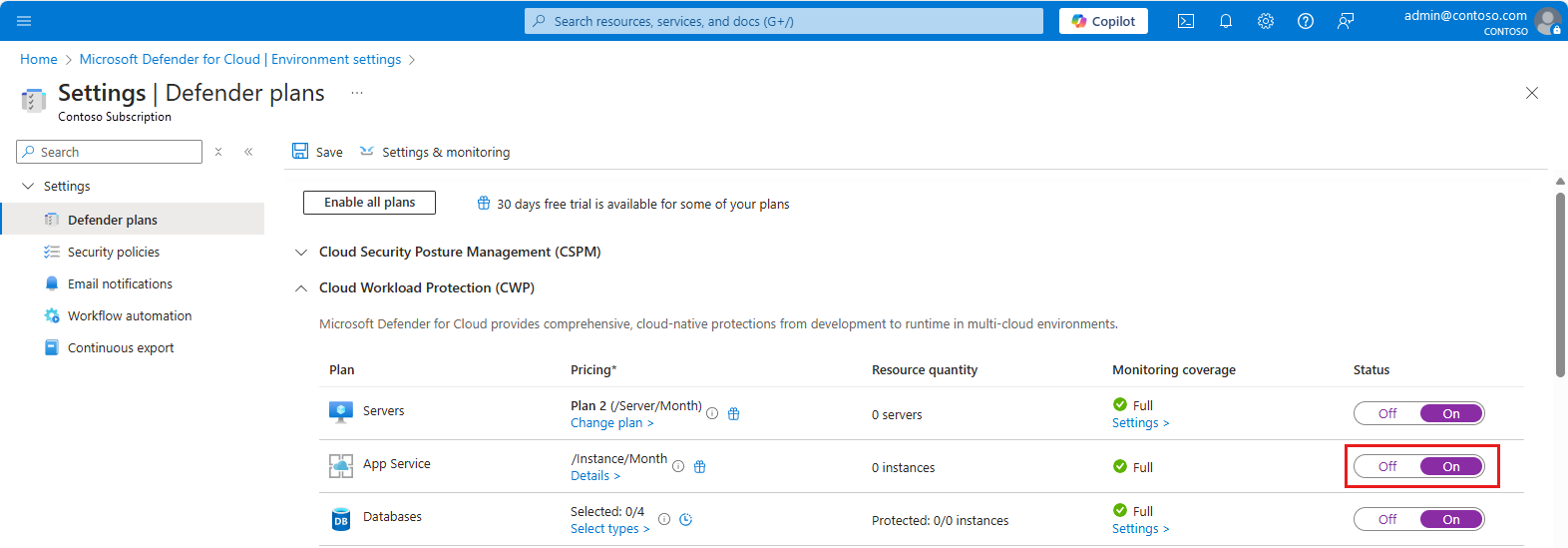 Screenshot that shows where on the Defender plans page to toggle the app service plan switch to on.