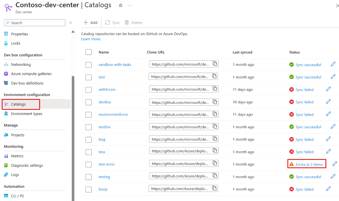 When you add or sync a catalog, you might encounter a sync error or warning. A sync error indicates that a catalog failed to sync successfully, A sync warning indicates that some or all of the catalog items have errors. You can view the sync status and errors in the Azure portal, or use the Azure CLI and REST API to troubleshoot and resolve the errors.