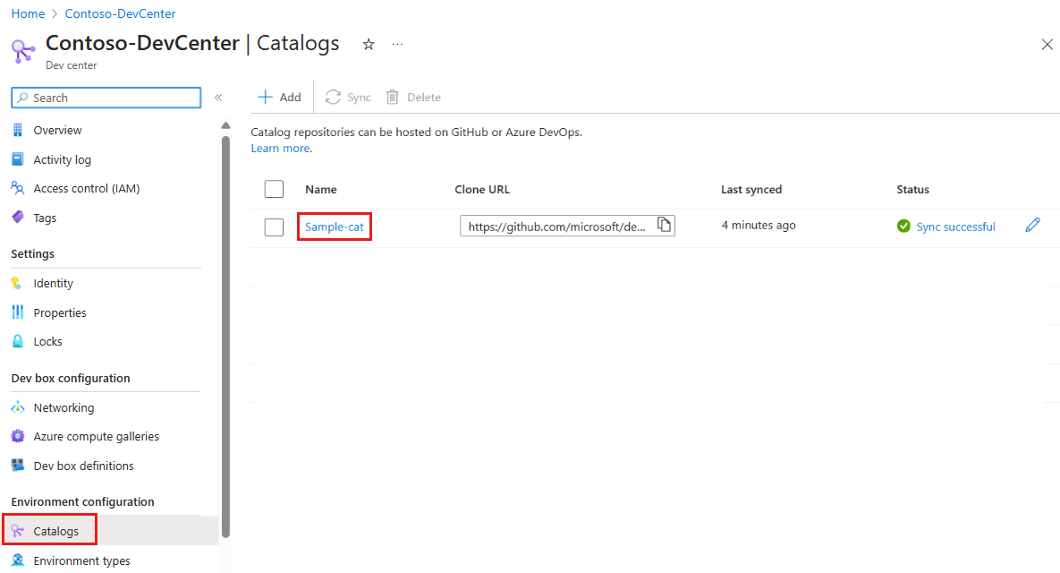 On the left menu for your dev center or project, under Environment configuration, select Catalogs.