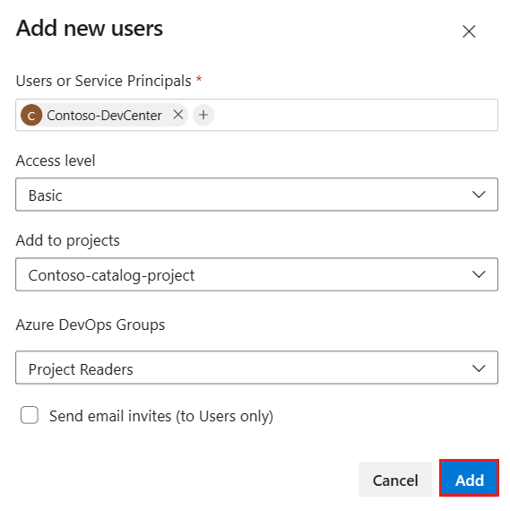 When you use a system-assigned MSI, specify the name of the dev center or project, not the object ID of the managed account. When you use a user-assigned MSI, use the name of the managed account.Access level Select Basic. Add to projects Select the project that contains your repository. Azure DevOps Groups Select Project Readers. Send email invites (to Users only) Clear the checkbox.