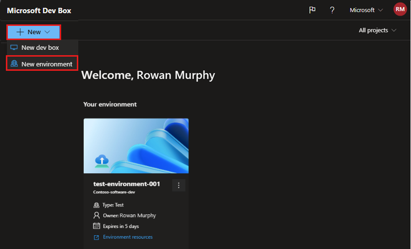 1. If you don't have any dev boxes, you see this screen. Select New environment.