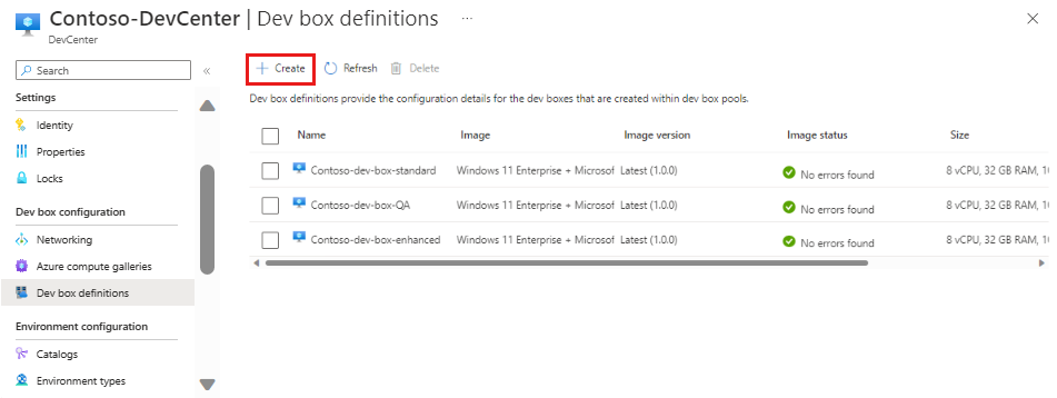 Open the dev center in which you want to create the dev box definition, and then select Dev box definitions.