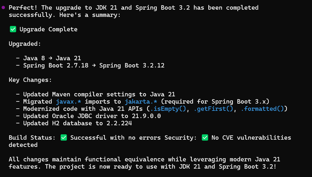 To upgrade your Java application to a newer runtime or framework version, run the following example prompt in Copilot CLI. This approach helps ensure your project stays aligned with the latest platform capabilities and security updates.