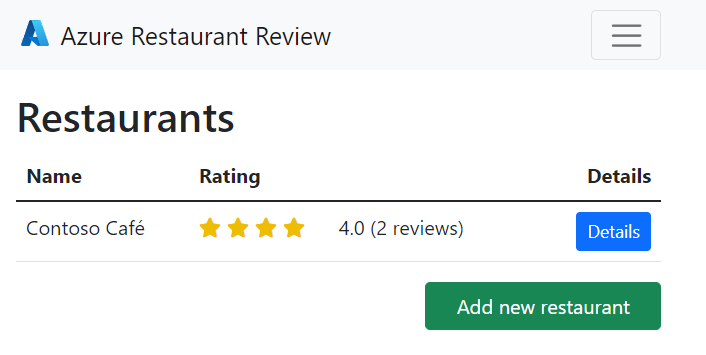Here's an example of the sample website after the addition of a restaurant and two reviews.