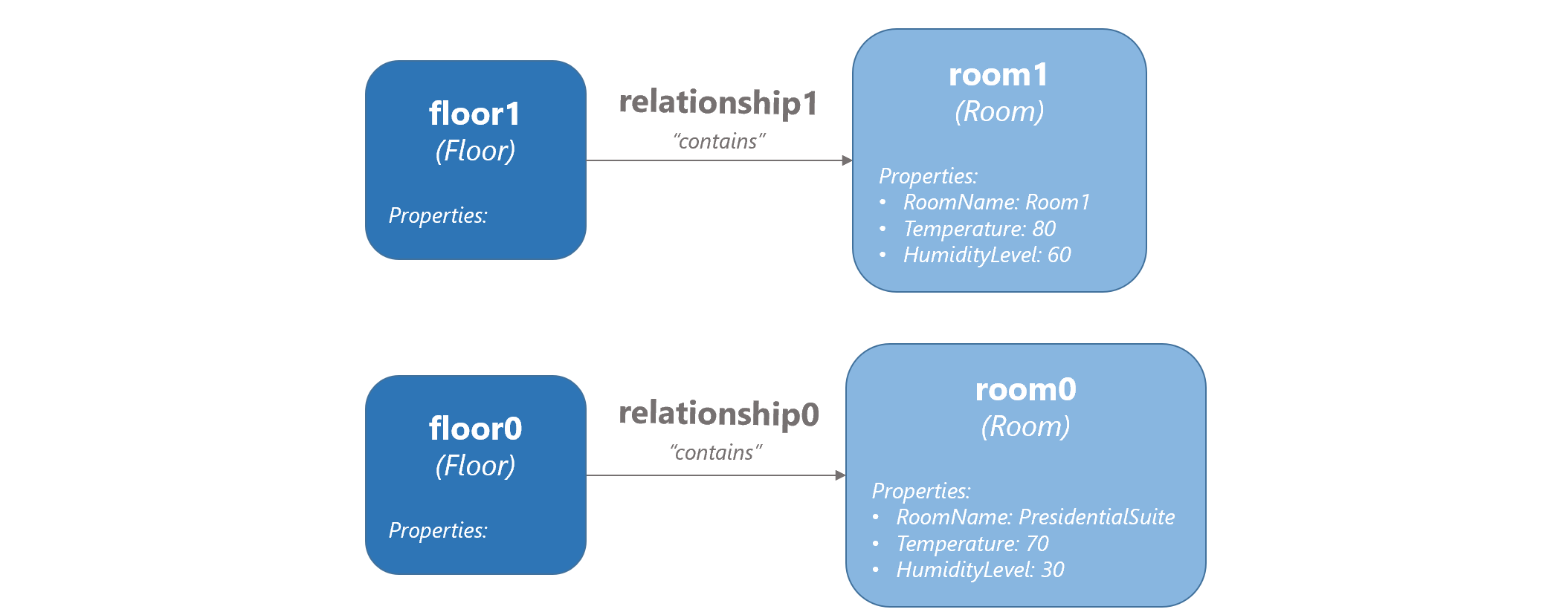 containsrelationship from each of the Floor twins you created earlier to a corresponding Room twin. The relationships are named relationship0 and relationship1.CreateRelationship floor0 contains room0 relationship0 CreateRelationship floor1 contains room1 relationship1Tip