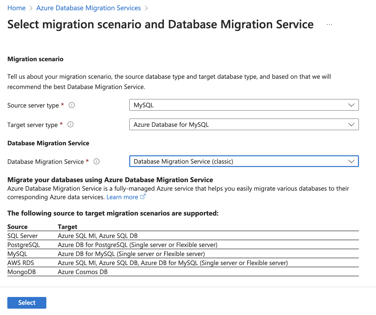 On the Select migration scenario and Database Migration Service page, under Migration scenario, select MySQL as the source server type, and then select Azure Database for MySQL as target server type, and then select Select.
