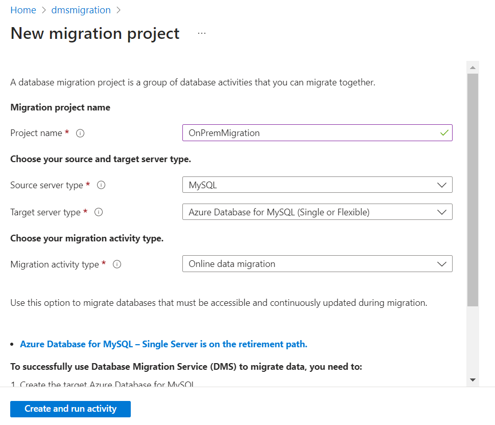 On the New migration project page, specify a name for the project, in the Source server type selection box, select MySQL, in the Target server type selection box, select Azure Database For MySQL - Flexible Server, in the Migration activity type selection box, select Online data migration, and then select Create and run activity.