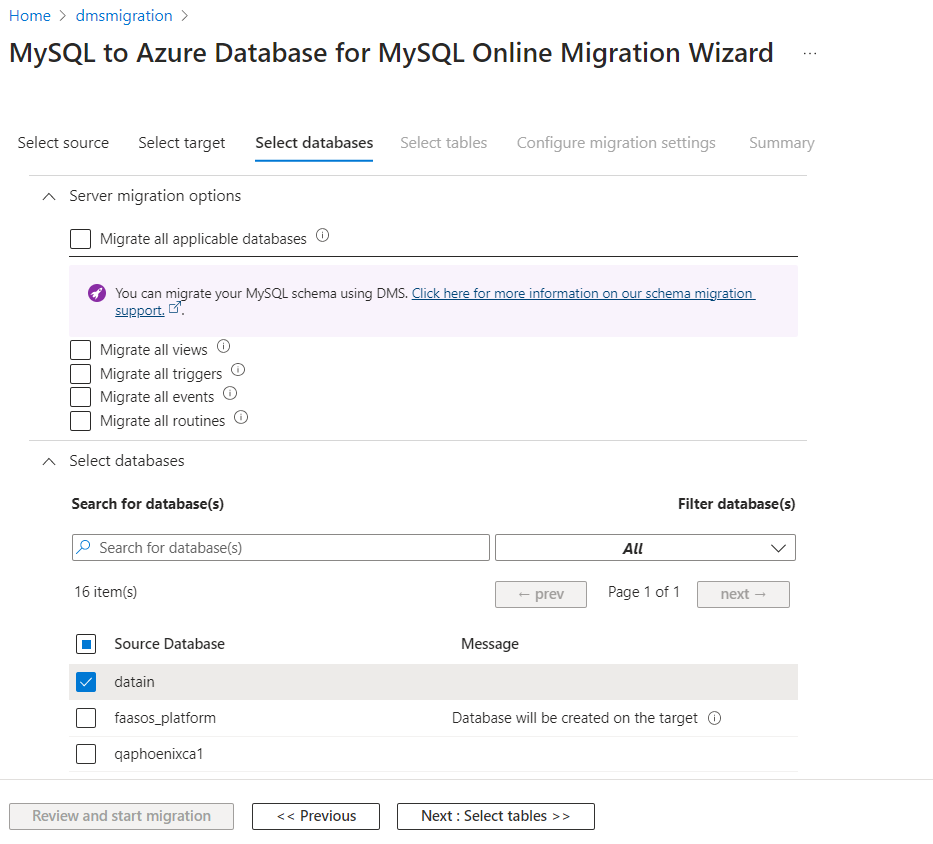There's now a Migrate all applicable databases option. When selected, this option migrates all user created databases and tables. Because Azure Database for MySQL - Flexible Server doesn't support mixed case databases, mixed case databases on the source aren't included for an online migration.