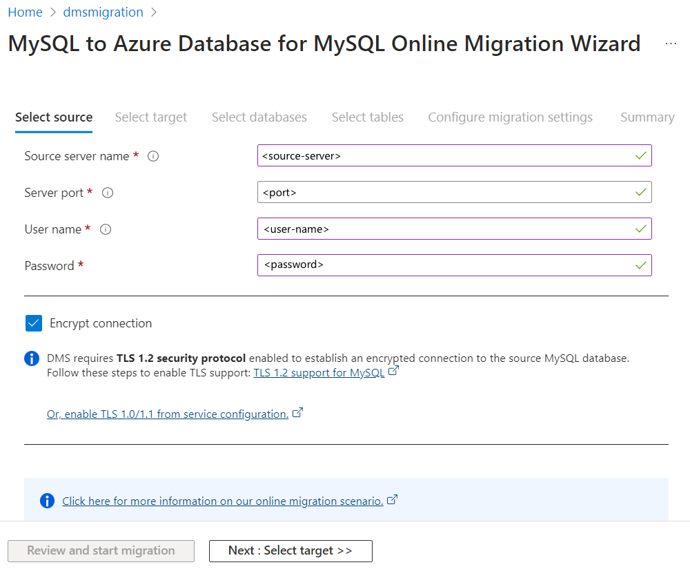 On the Select source screen, we have to ensure that DMS is in the virtual network that has connectivity to the source server. Here you'll input source server name, server port, username, and password to your source server.