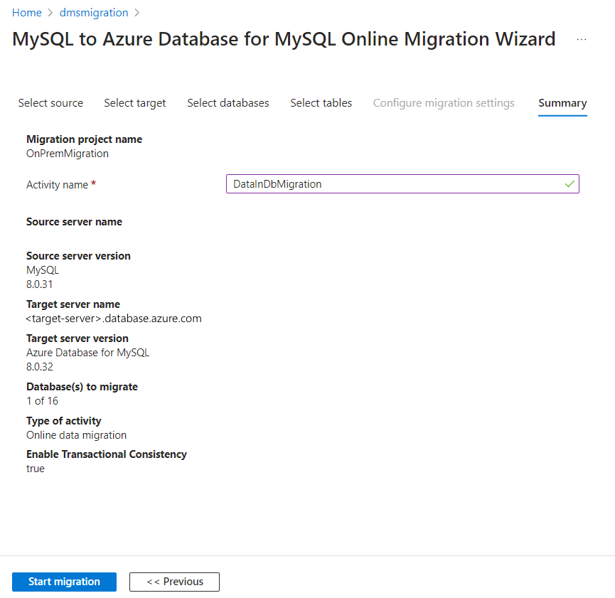 On the Summary tab, in the Activity name text box, specify a name for the migration activity, and then review the summary to ensure that the source and target details match what you previously specified.