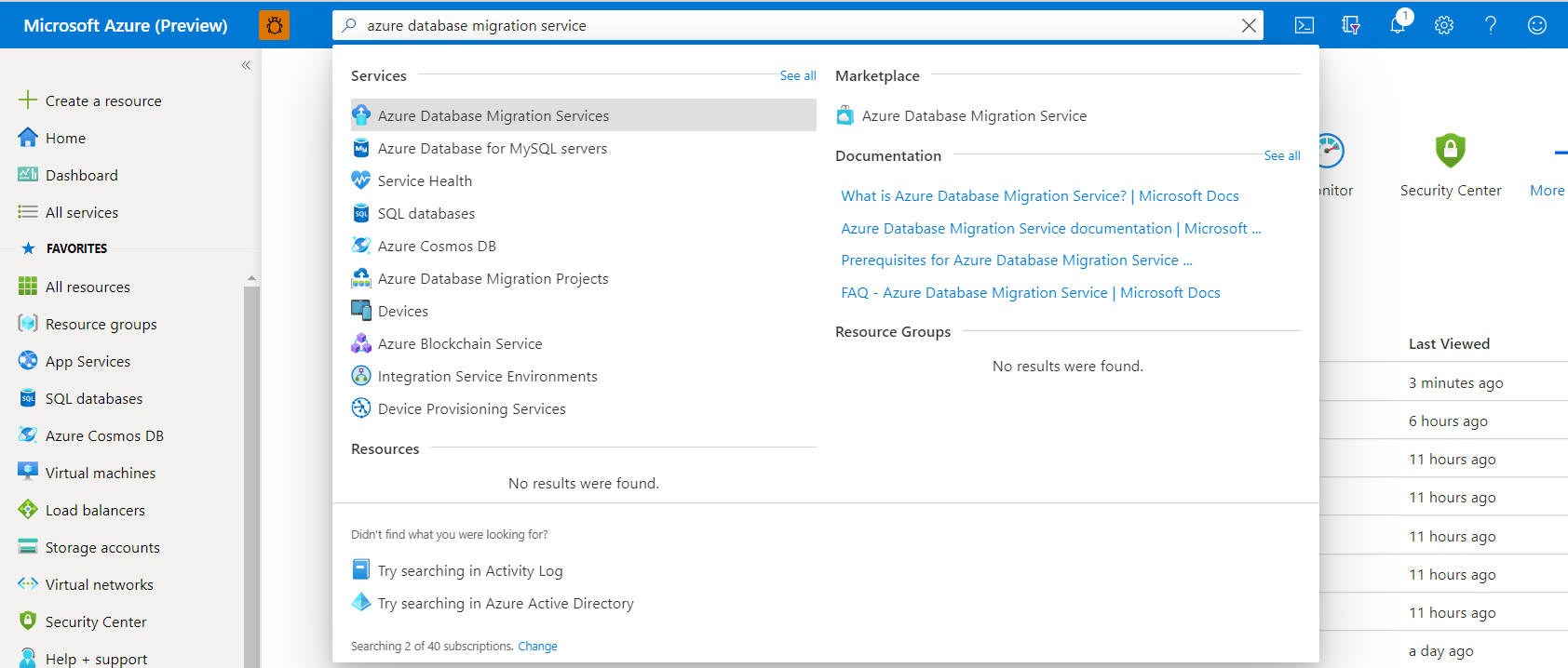 In the Azure portal, select + Create a resource, search for the term "Azure Database Migration Service", and then select Azure Database Migration Service from the dropdown list.