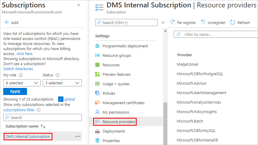 Select the subscription that you want to use to create the DMS instance, and then select Resource providers.