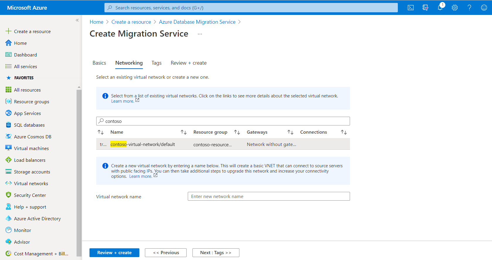 On the Networking tab, select an existing virtual network from the list or provide the name of new virtual network to create, and then select Review + Create.