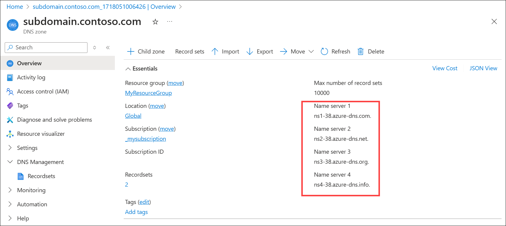 3. You'll find a record set of type NS and name subdomain created in the parent DNS zone. Compare the name servers in this record set with the ones you retrieved from the child DNS zone. The NS records should match.