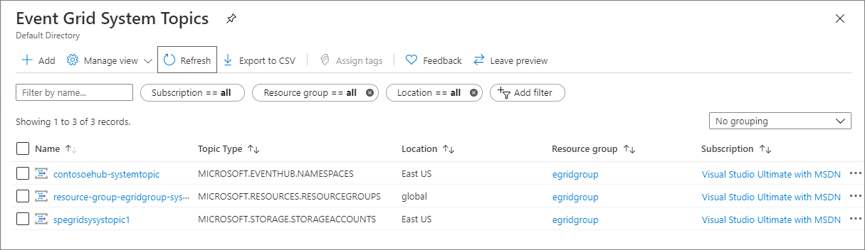 Follow these steps to view all existing Event Grid system topics.