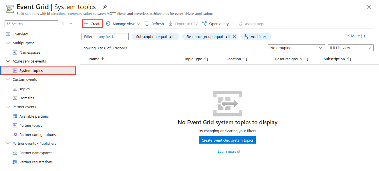 This article shows you how to create and manage system topics using the Azure portal. For an overview of system topics, see System topics.