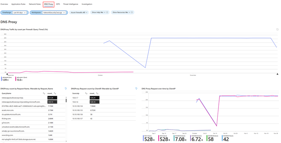 - DNS Proxy Request over time by Client IP: Displays DNS proxy requests over time, categorized by client IP.