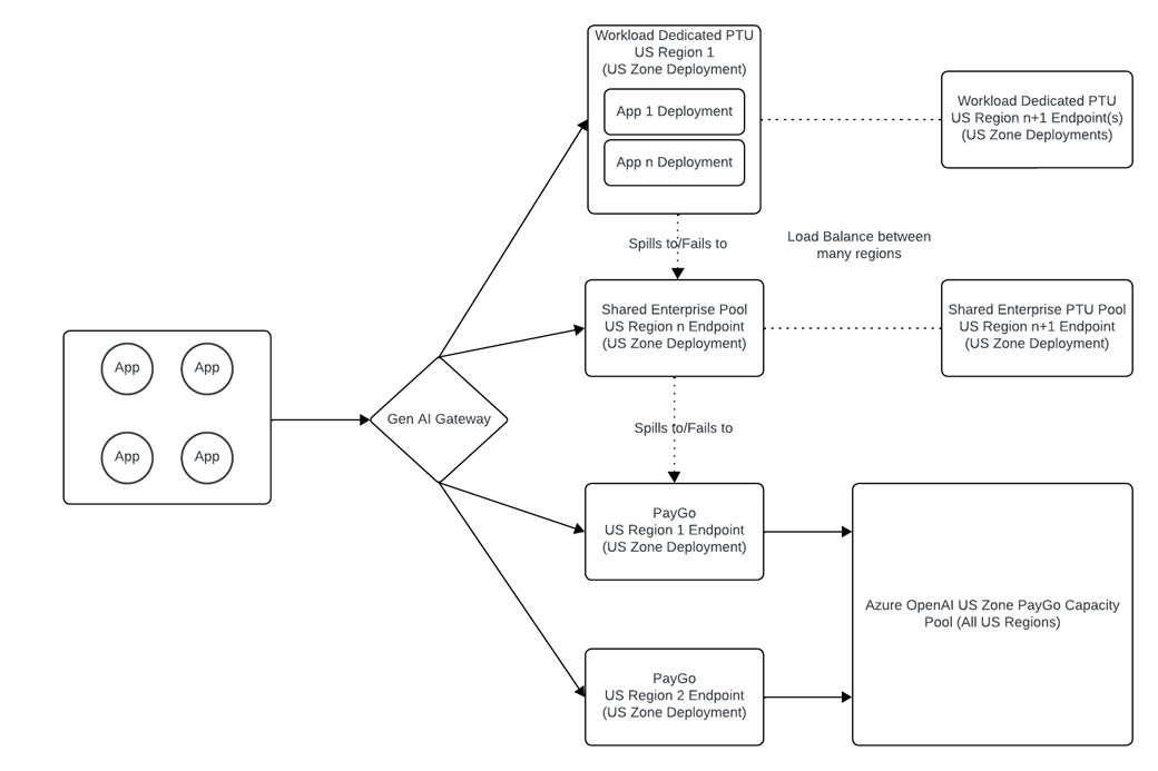 - For provisioned deployments, we recommend having a single Data Zone PTU deployment (available December 4, 2024) that serves as an enterprise pool of PTU. You can use API Management to manage traffic from multiple applications to set throughput limits, logging, priority, and failover logic.