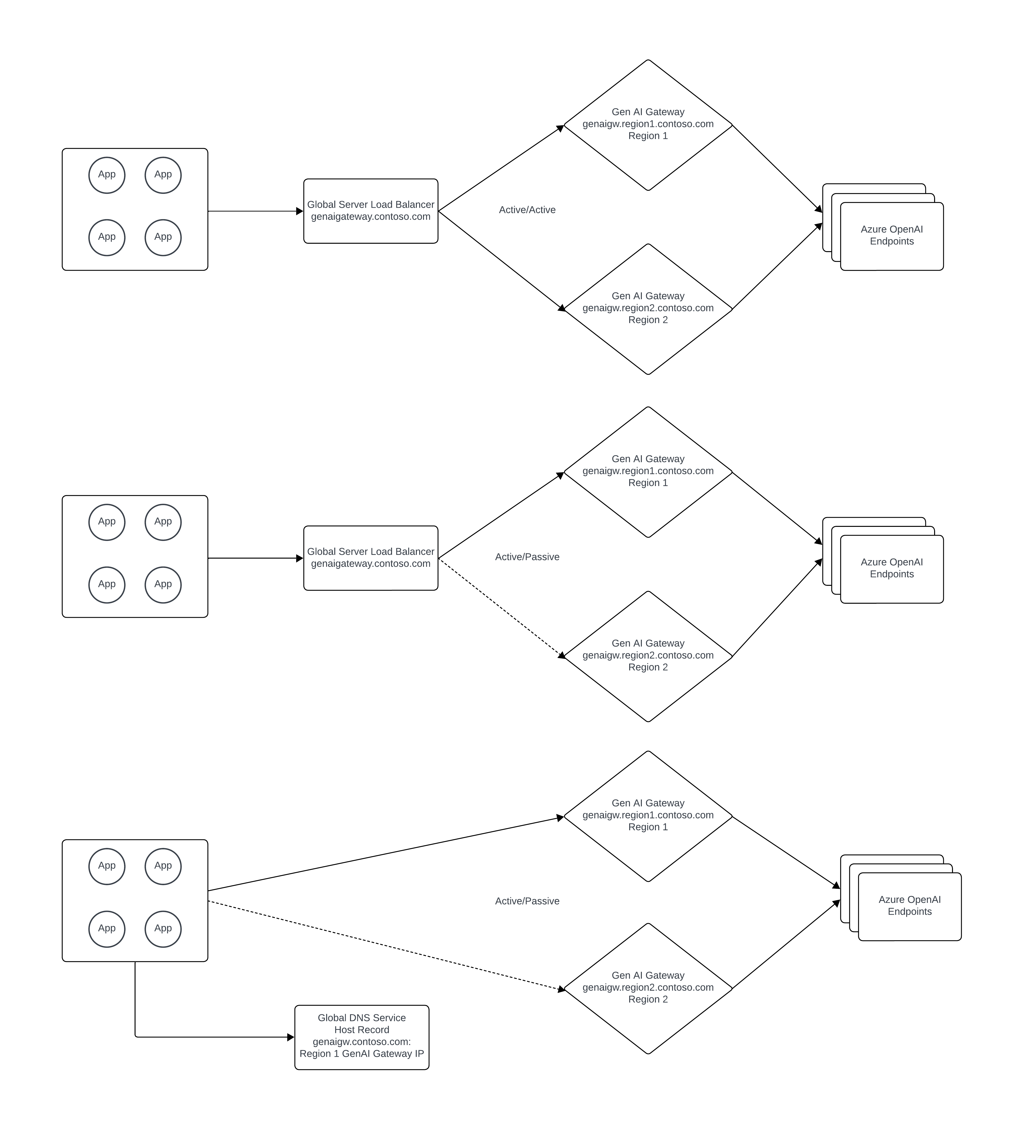 - A private global server load balancer should be used to load balance across the multiple Generative AI Gateway instances in either an active/active or active/passive manner. Azure doesn't have a native service for global server load balancer for workloads that require private DNS resolution. For more background on this topic you can refer to this unofficial guide: https://github.com/adstuart/azure-crossregion-private-lb. In lieu of a global server load balancer, organizations can achieve an active/passive pattern through toggling the DNS record for the Generative AI Gateway.