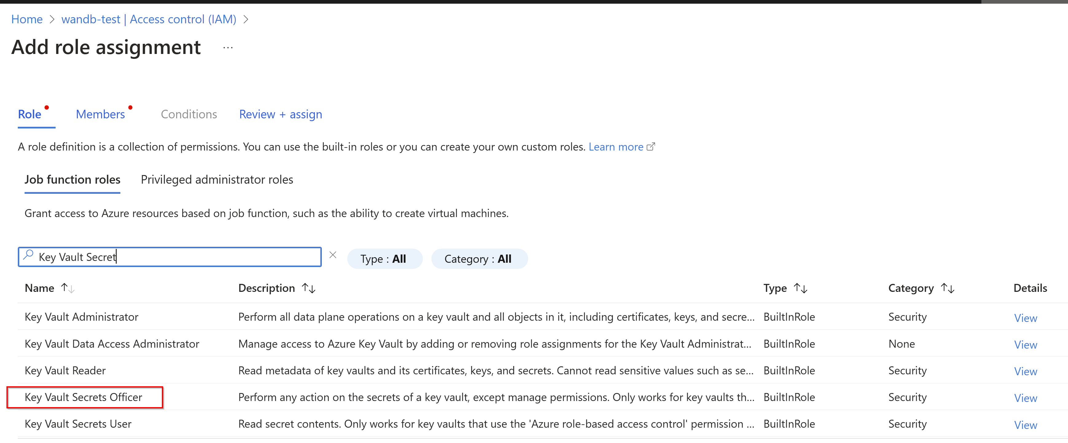 Choose Key Vault Secrets Officer, add your account as a member, and select review & assign.