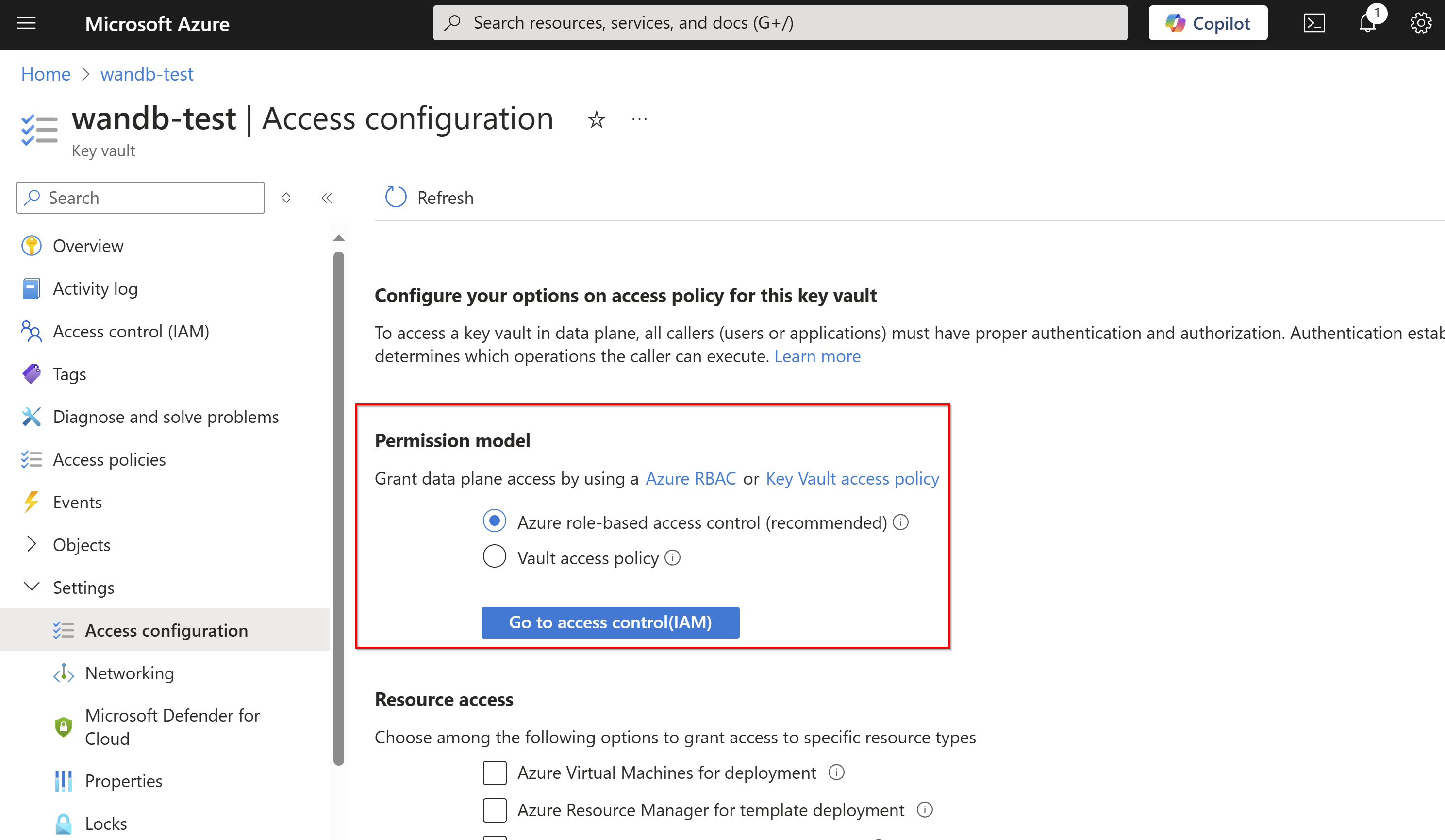 Go to Settings > Access configuration. Under Permission model, we recommend you select Azure role-based access control if this isn't already selected. Learn more about Azure role-based access control.