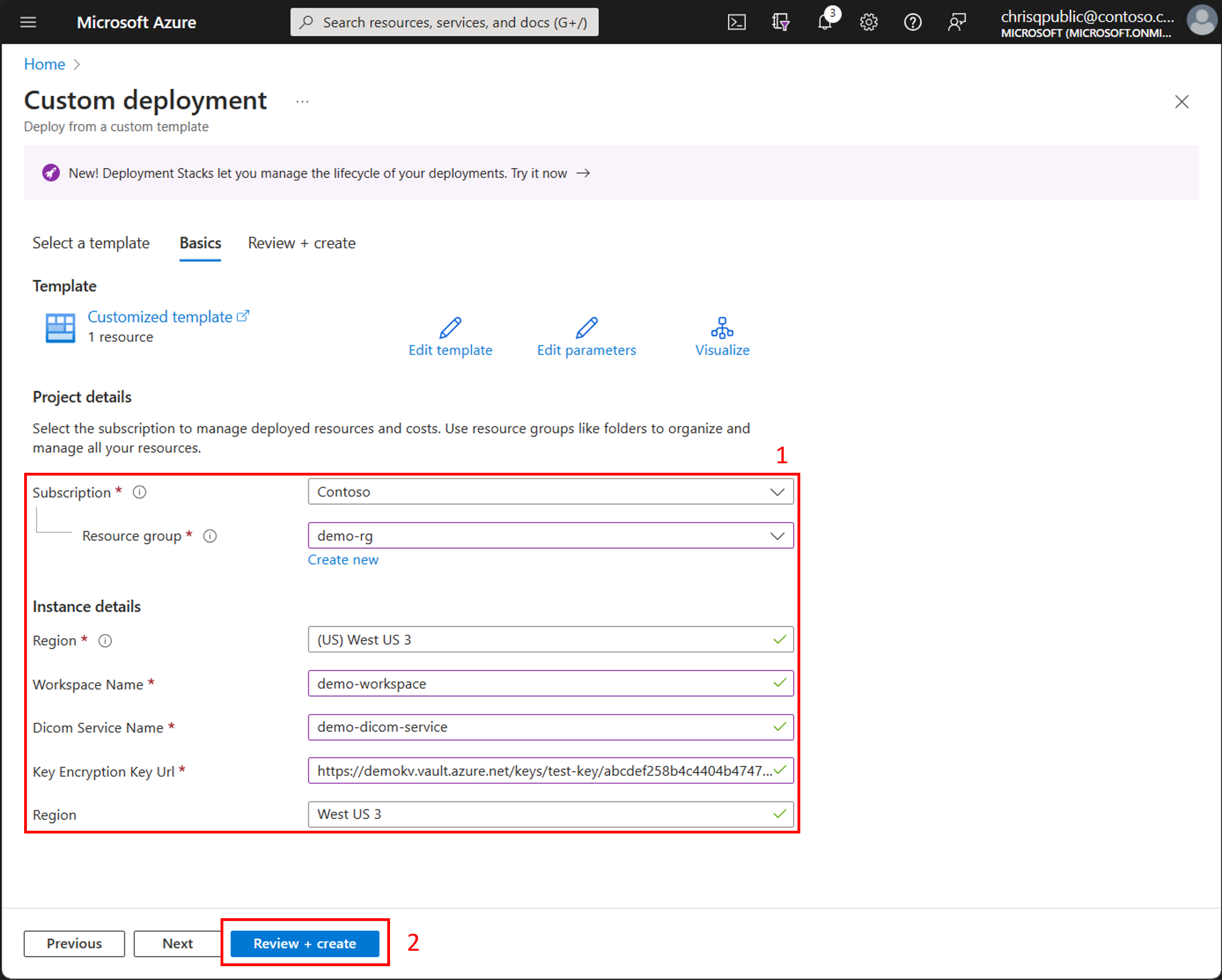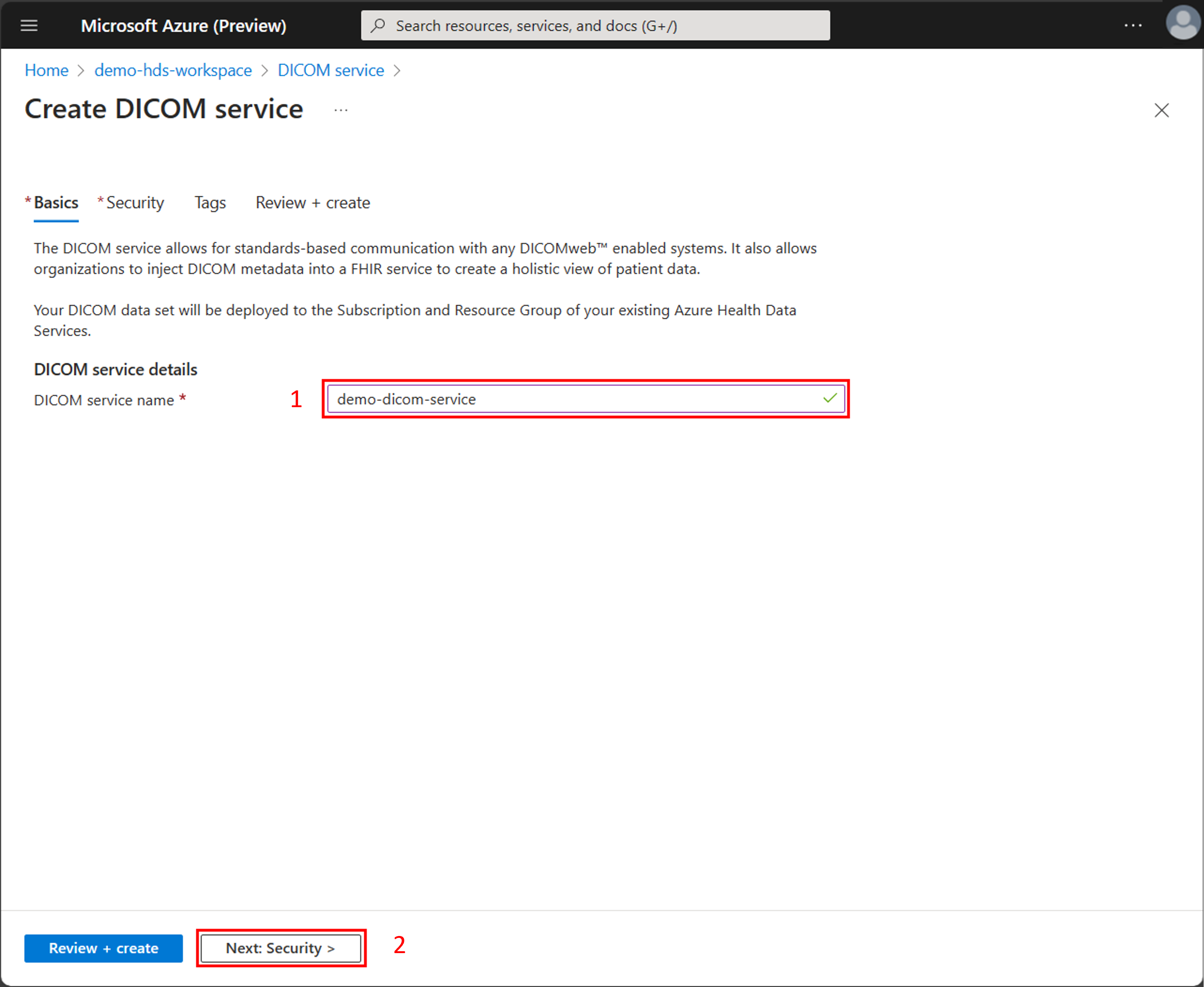 When prompted, select the values for the resource group, region, workspace, and DICOM service name.