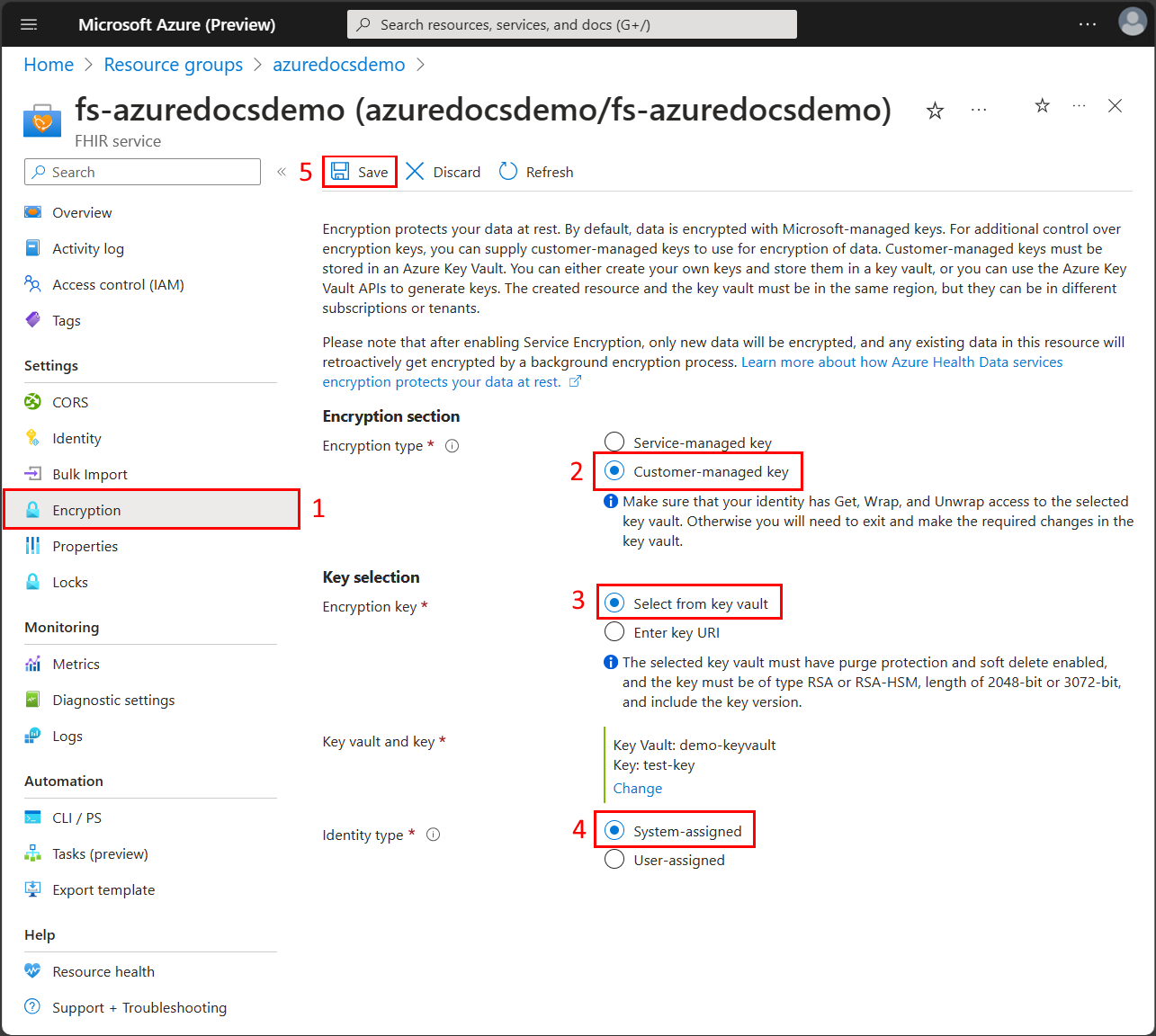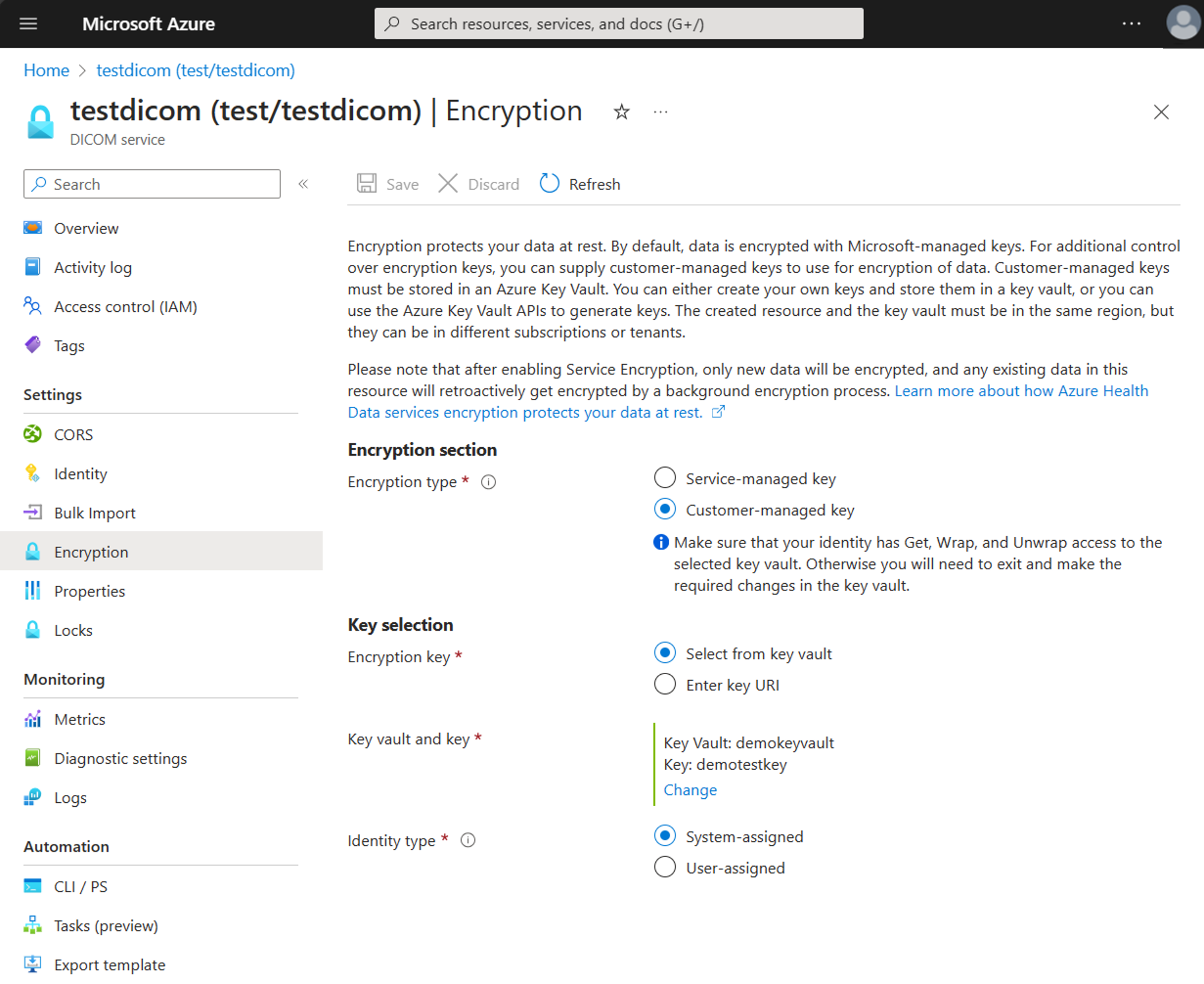 In the Azure portal, go to the DICOM service and then select Encryption from the left pane.