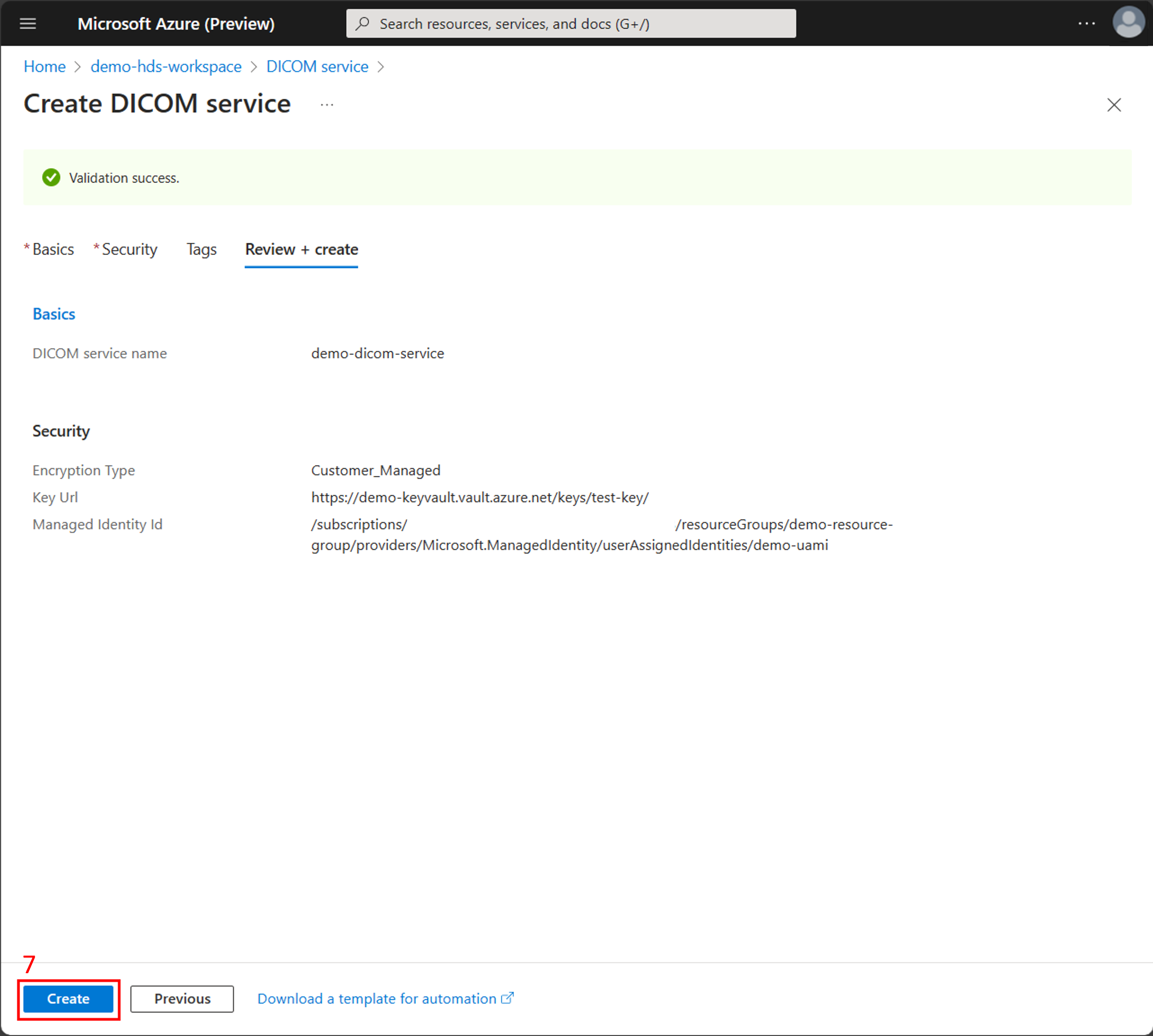On the Review + create tab, review the summary of the configuration options and the validation success message. Choose Create to deploy the DICOM service with customer-managed keys.