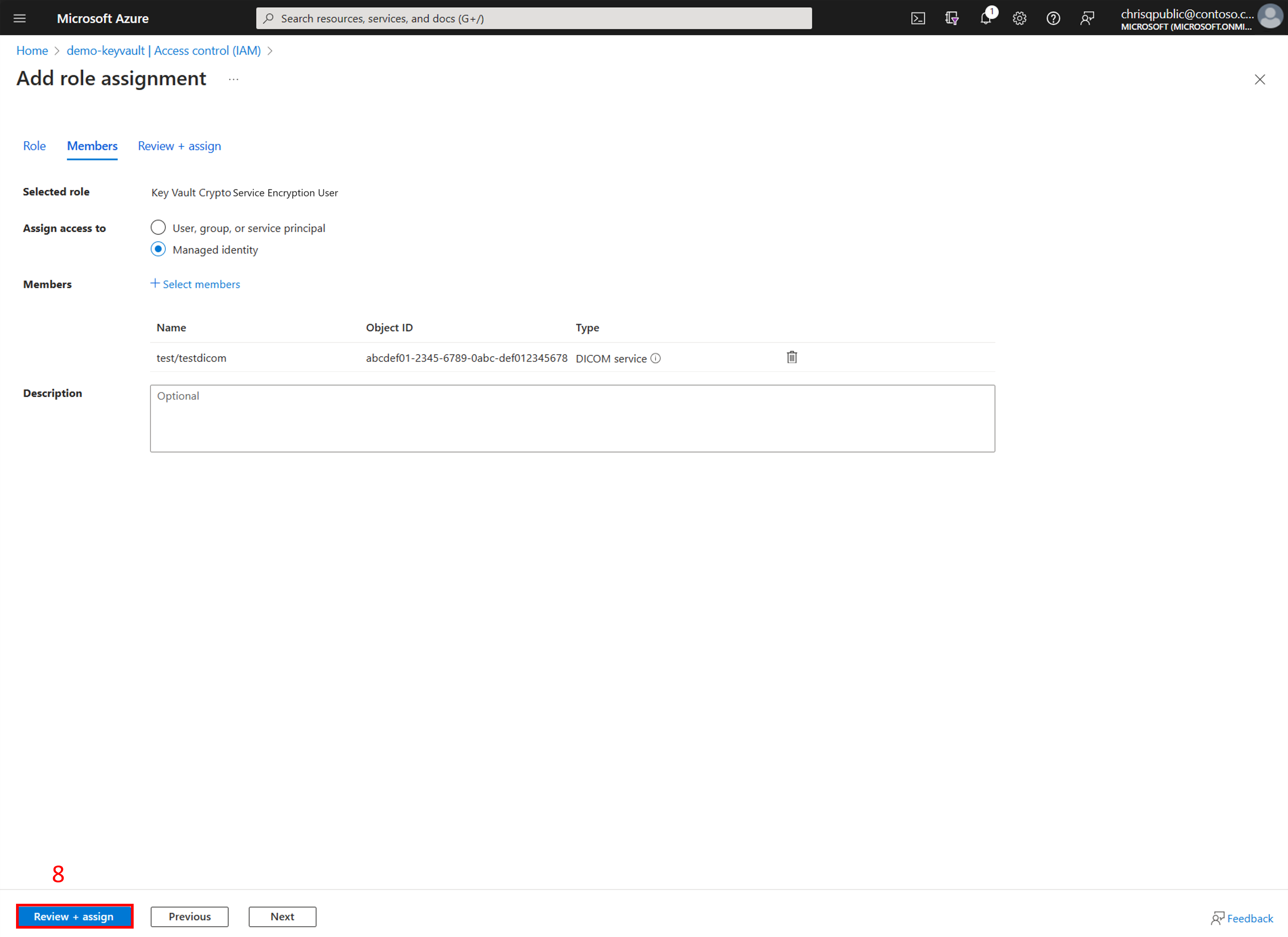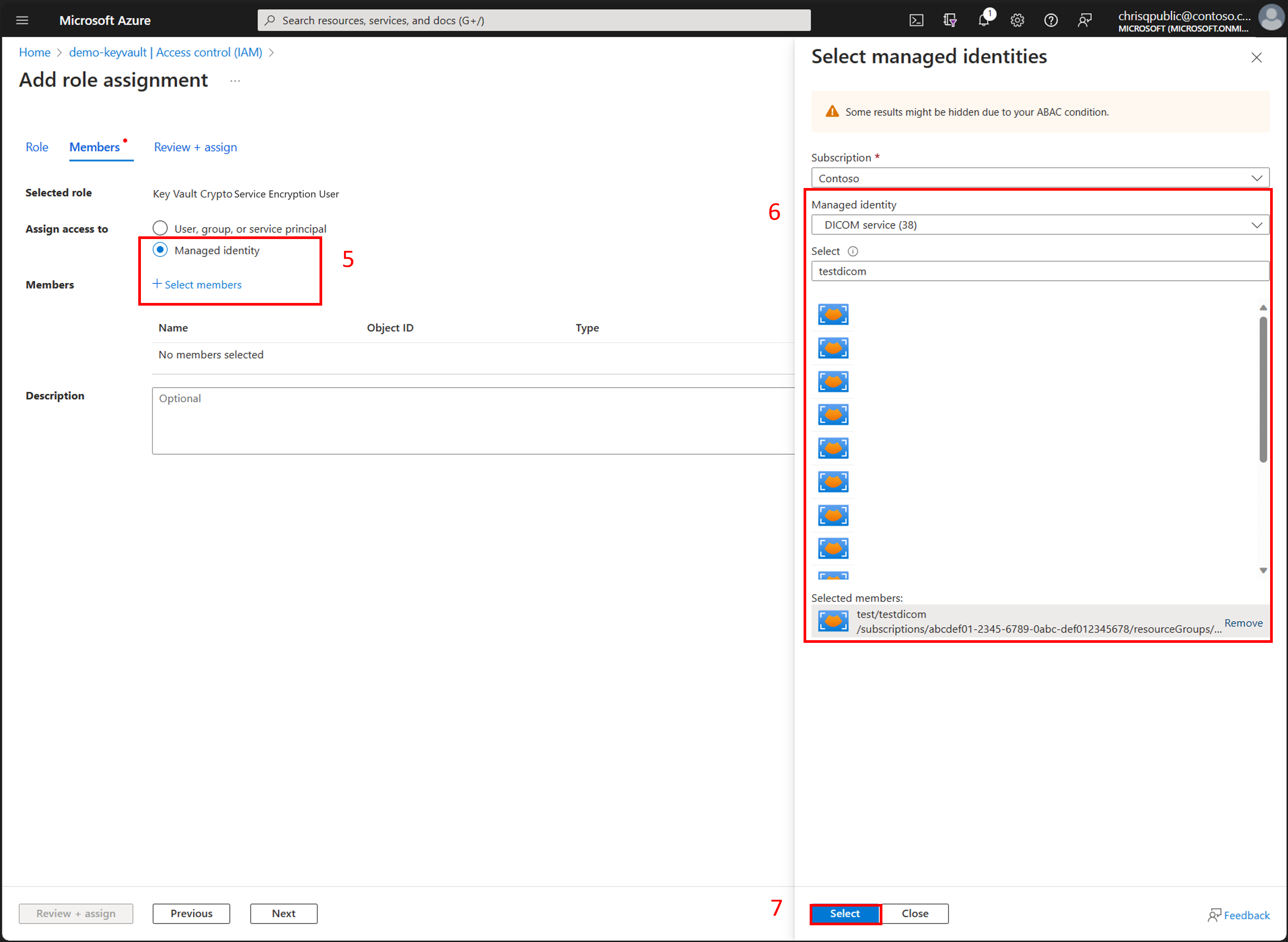 On the Select managed identities pane, select DICOM service from the Managed identity drop-down list. Select your DICOM service.
