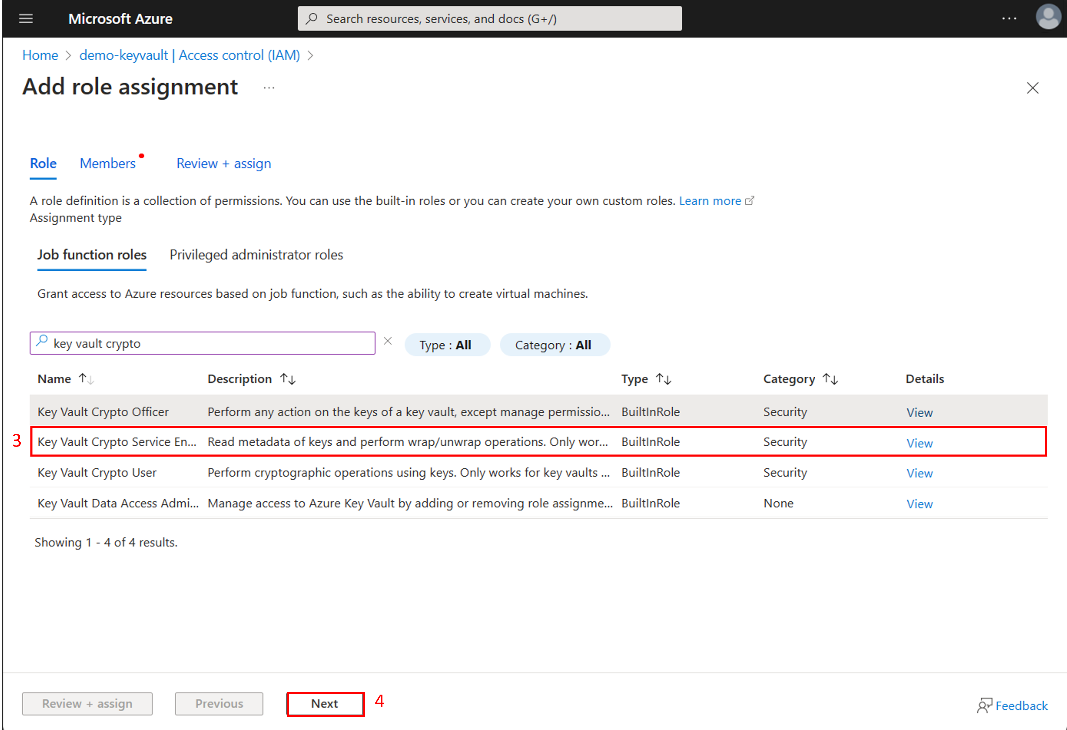 On the Add role assignment page, select the Key Vault Crypto Service Encryption User role.