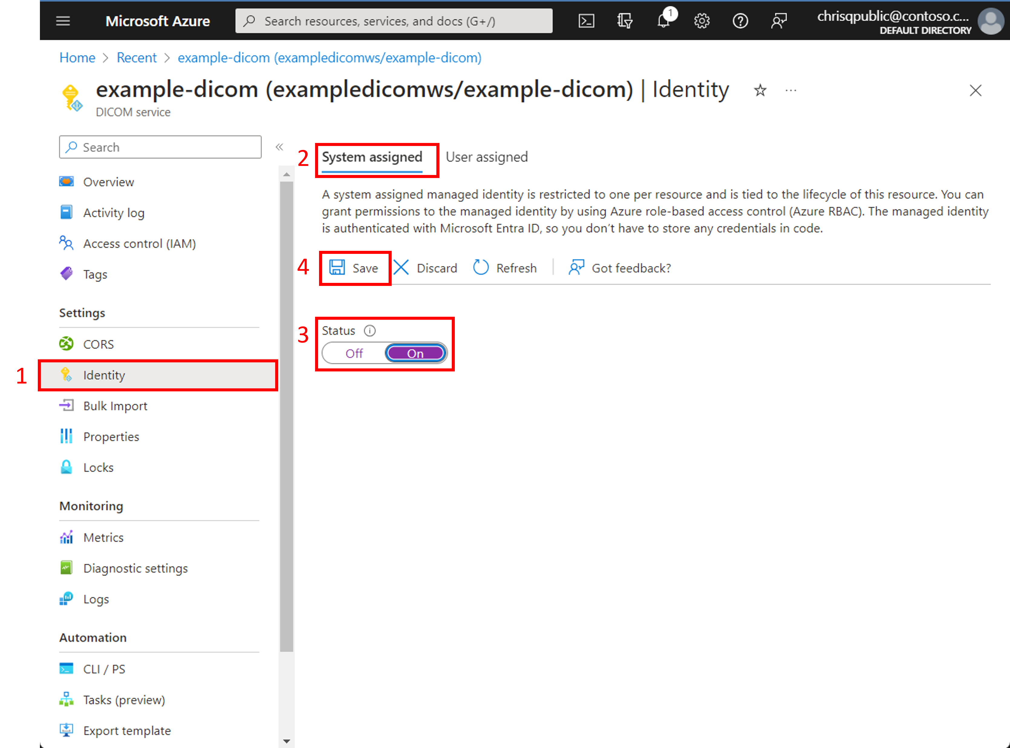 In the Azure portal, go to the DICOM instance. Select Identity from the left pane.