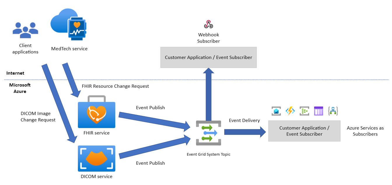 Scalable. Events support growth and change in an organization's healthcare data needs by using the Azure Event Grid service and creating a system topic for Azure Health Data Services. For more information, see Azure Event Grid event schema and Azure Health Data Services as an Event Grid source.