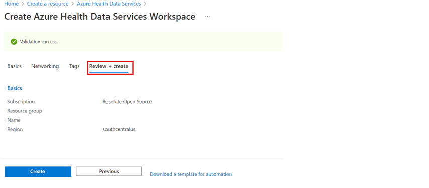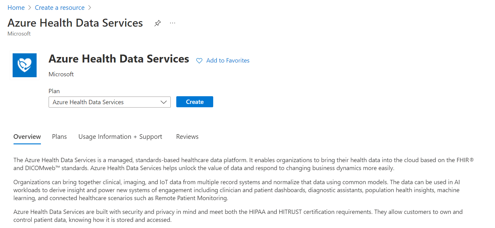 Choose Create to create an Azure Health Data Services account.