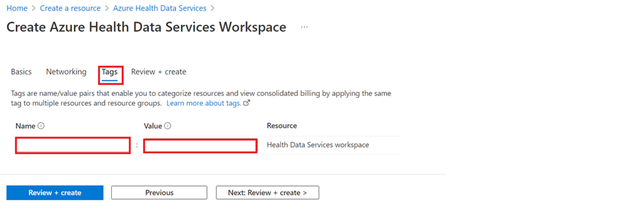 Select Next: Tags > if you want to include name and value pairs to categorize resources and view consolidated billing by applying the same tag to multiple resources and resource groups. Enter a Name and Value for the workspace, and then select Review + create or Next: Review + create. For more information about tags, see Use tags to organize your Azure resources and management hierarchy.