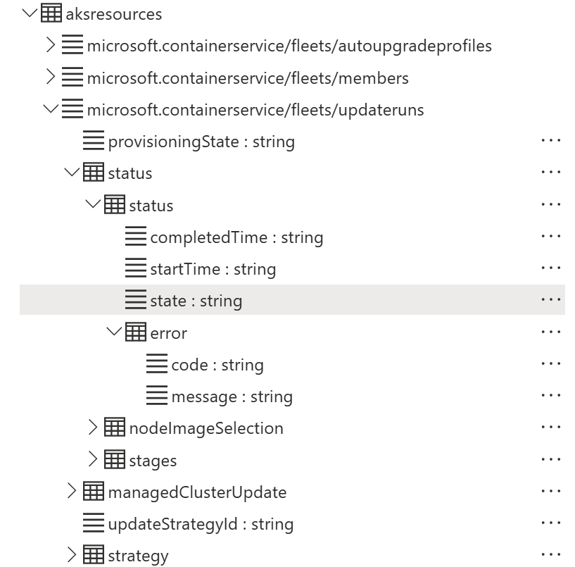 aksresources | where type == "microsoft.containerservice/fleets/updateruns" | where id contains ('Microsoft.ContainerService/fleets/your-fleet-name') | where properties['status']['status']['state'] == "INSERT_VALUE_HERE"Replace the