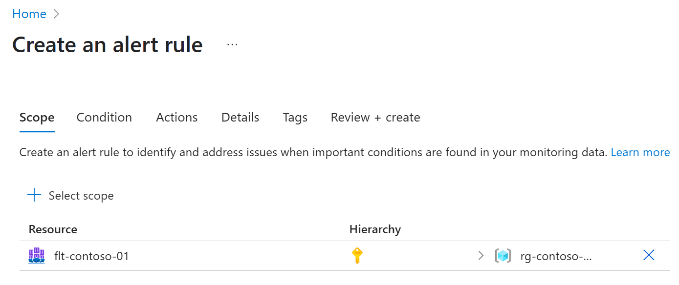 On the Create an alert rule screen, select + Select scope and in the Select a resource blade, navigate to your Fleet Manager resource by selecting the Azure Subscription and resource group it resides in.