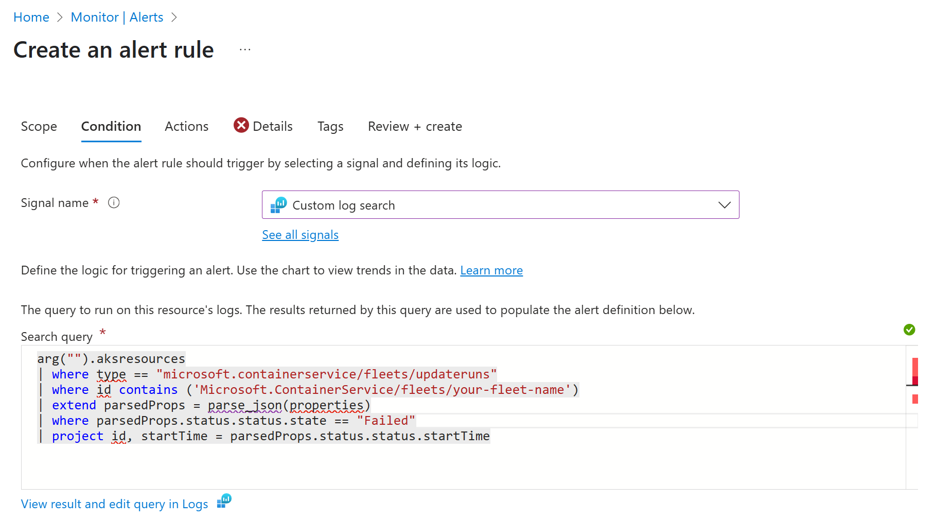 aksresourcestable witharg("").. The remaining syntax is unchanged from the queries used earlier in this article.arg("").aksresources | where type == "microsoft.containerservice/fleets/updateruns" | where id contains ('Microsoft.ContainerService/fleets/your-fleet-name') | extend parsedProps = parse_json(properties) | where parsedProps.status.status.state == "Failed" | project id, startTime = parsedProps.status.status.startTimeOnce you're happy with the results being returned by the query, select Continue Editing Alert to close the Logs blade. The query is automatically inserted into the Search query box. You can continue to edit it here if you wish.