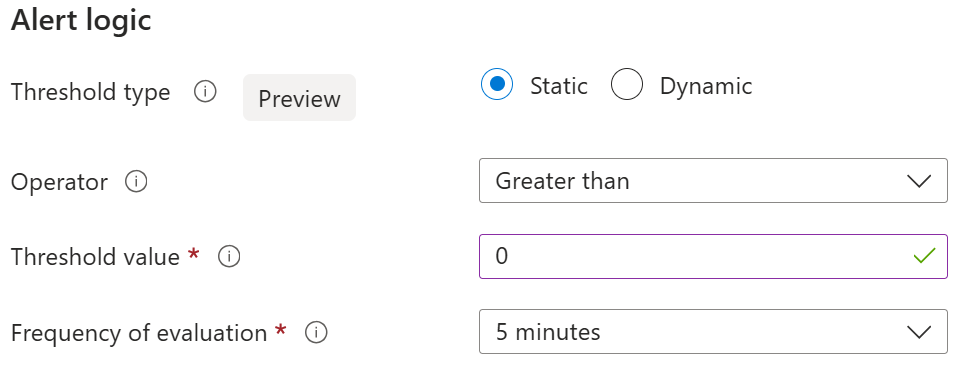 Scroll down until you see Alert logic, using the form field to define the criteria you wish to trigger the alert. It's recommended you use a Static Threshold, setting the value to 0, and the Operator to Greater than. Adjust the frequency to suit your preferred time period.