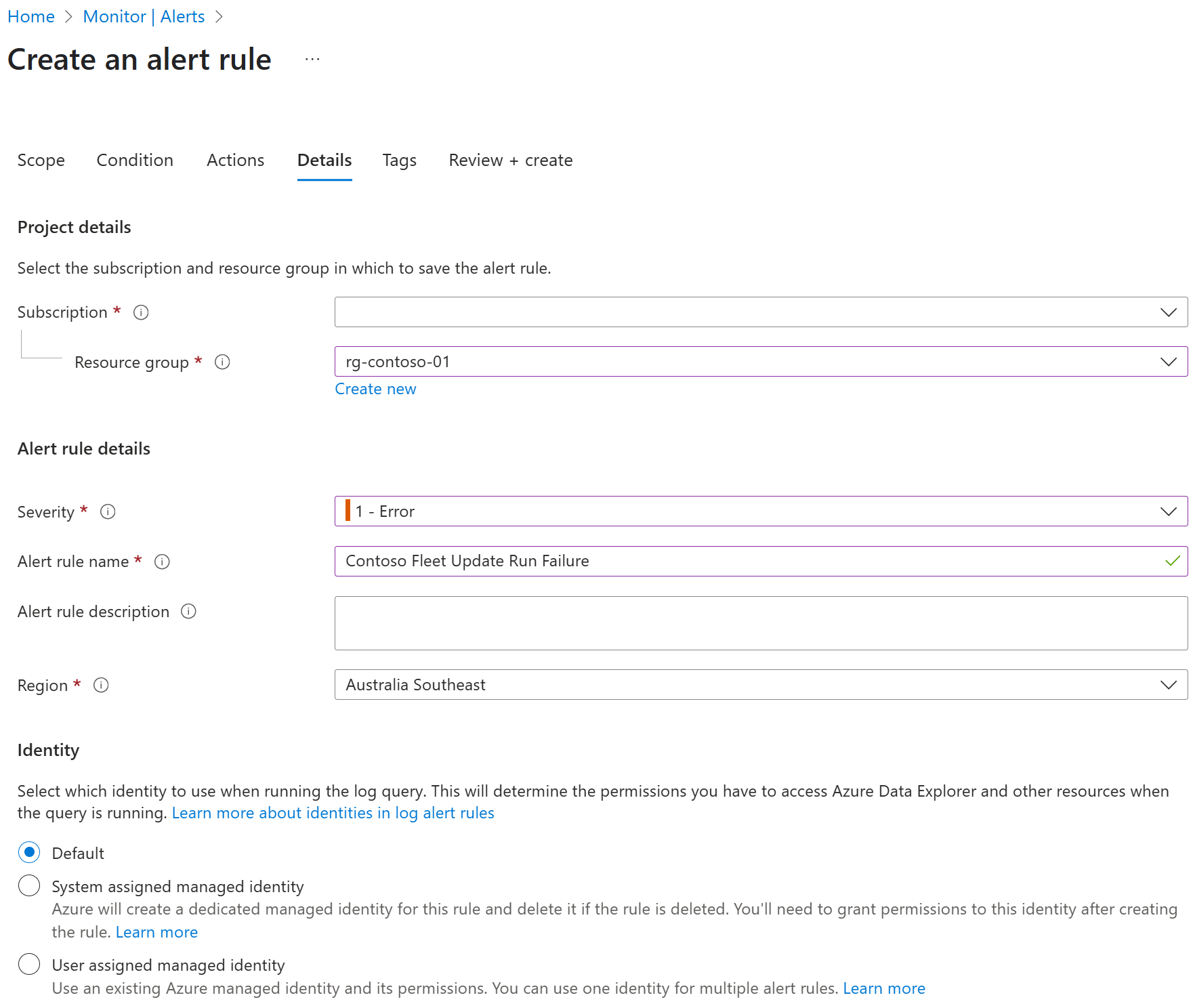 To save the alert rule, select the Details tab and choose an appropriate Azure Subscription and resources group. Set the details for the alert rule by choosing a Severity, providing an alert rule name, optional description, and then select the Azure Region to save the alert to. Finally, set the Identity you wish to use to run the log query.
