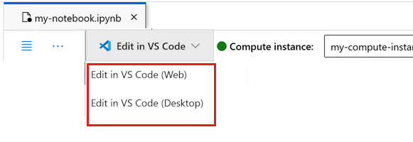 5. You can run the notebook here, or open it in VS Code for a full integrated development environment (IDE) with the power of Azure Machine Learning resources. Select Open in VS Code, then select either the web or desktop option. When launched this way, VS Code is attached to your compute instance, the kernel, and the workspace file system.