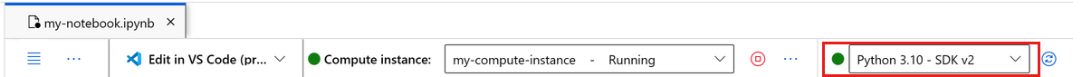 3. Wait until the compute instance is running. Then make sure that the kernel, found on the top right, is Python 3.10 - SDK v2. If not, use the dropdown list to select this kernel.