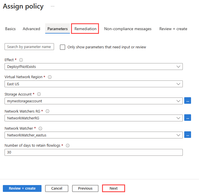 Setting Value Effect Select DeployIfNotExists to enable the execution of the policy. The other available option is: Disabled. Virtual Network Region Select the region of your virtual network that you're targeting with the policy. Storage Account Select the storage account. The storage account must be in the same region as the virtual network. Network Watcher RG Select the resource group of your Network Watcher instance. The flow logs created by the policy are saved into this resource group. Network Watcher Select the Network Watcher instance of the selected region. Number of days to retain flowlogs Select the number of days that you want to keep your flow logs data in the storage account. The default value is 30 days. If you don't want to apply any retention policy, enter 0. Select Next or the Remediation tab.